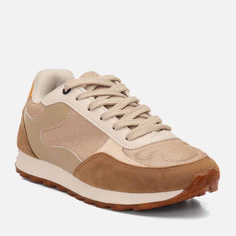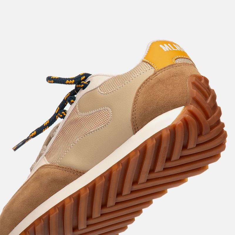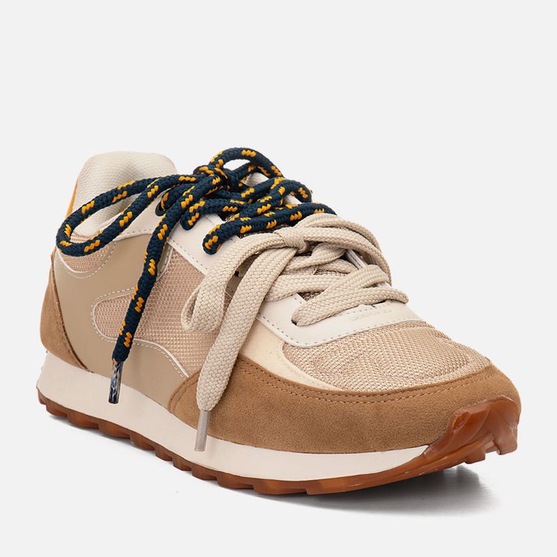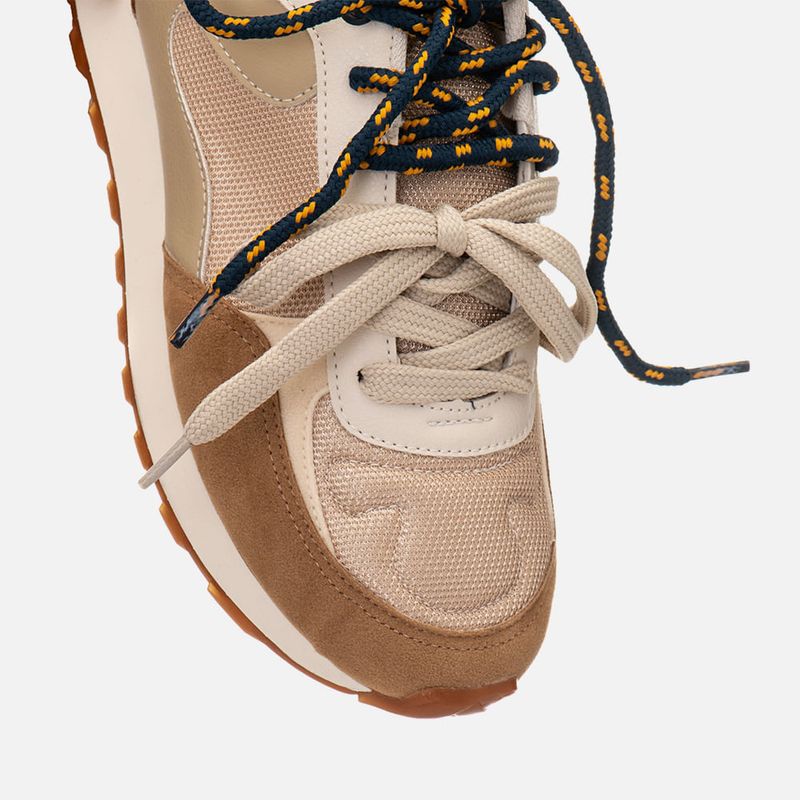 Tênis com Visual Esportivo Retrô com Recortes Multicolor e Multimateriais e Amarração 2 em 1 com Cadarço Duplo na cor Bege. Com solado emborrachado dentado na cor caramelo, solado macio, cabedal com traseira e bico arredondados, feito em recortes em mix de materiais: aveludado, napa lisa em três tons e malha mesh, possui detalhe em costura no bico e acompanhando os recortes, o modelo tem amarração feita em cadarço, podendo ser usado de 2 formas: com o cadarço superior em cordão bicolor ou apenas usando o cadarço inferior que é longo para ser usado em cor única, a traseira possui aplique em peça com tom constrastante e tem a inscrição MLNO-74, em alusão à Milano 1974 – ano de criação da marca. O interior é forrado em tecido em sobretom e tem o contorno do cano macio para maior conforto do calce, a palmilha tem a marca Milano aplicada em etiqueta 3D na cor dourada.