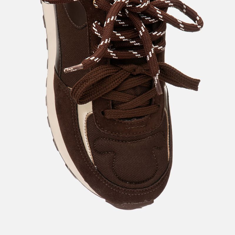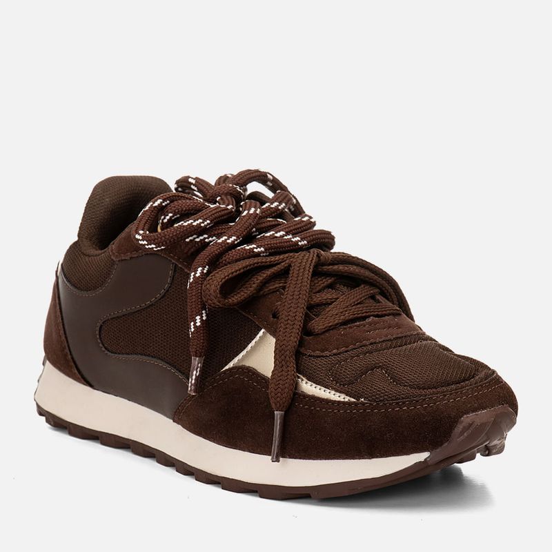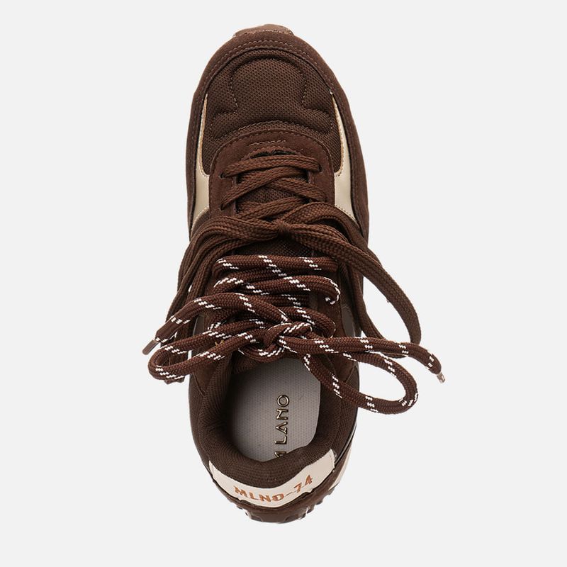 Tênis com Visual Esportivo Retrô com Recortes Multicolor e Multimateriais e Amarração 2 em 1 com Cadarço Duplo na cor Café. Com solado emborrachado dentado na cor caramelo, solado macio, cabedal com traseira e bico arredondados, feito em recortes em mix de materiais: aveludado, napa lisa em três tons e malha mesh, possui detalhe em costura no bico e acompanhando os recortes, o modelo tem amarração feita em cadarço, podendo ser usado de 2 formas: com o cadarço superior em cordão bicolor ou apenas usando o cadarço inferior que é longo para ser usado em cor única, a traseira possui aplique em peça com tom constrastante e tem a inscrição MLNO-74, em alusão à Milano 1974 – ano de criação da marca. O interior é forrado em tecido em sobretom e tem o contorno do cano macio para maior conforto do calce, a palmilha tem a marca Milano aplicada em etiqueta 3D na cor dourada.