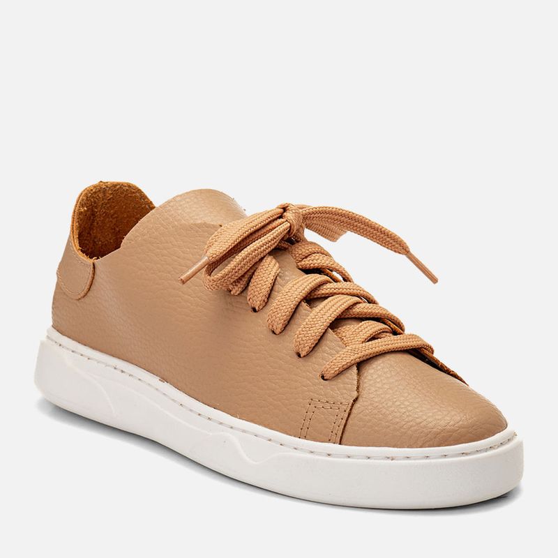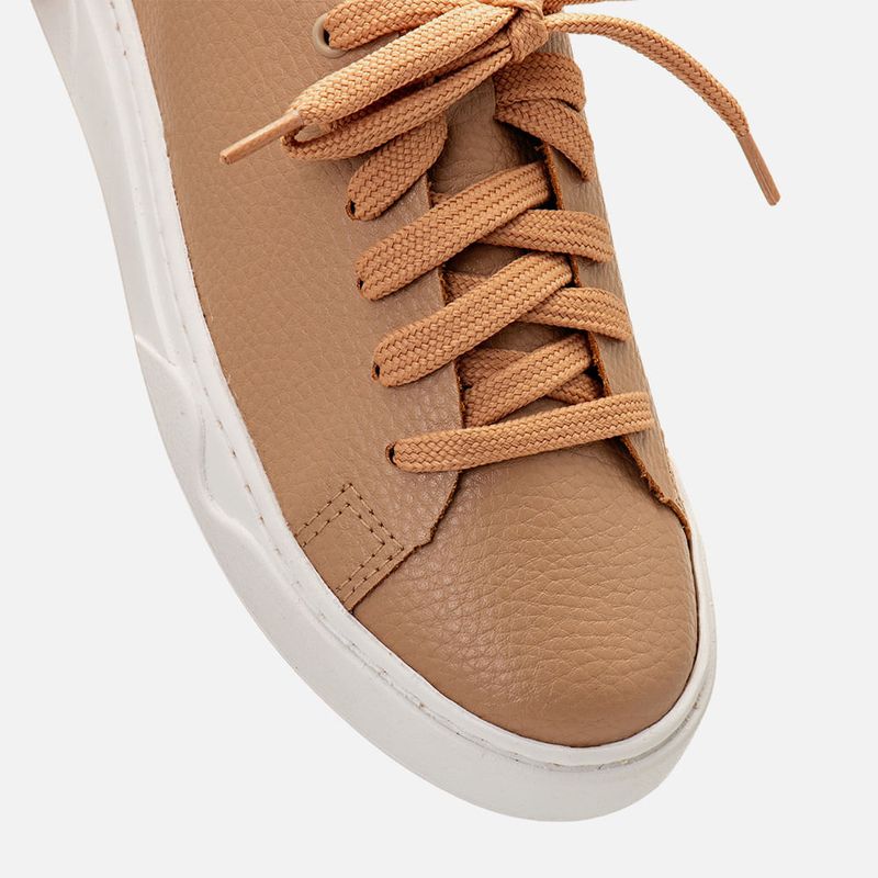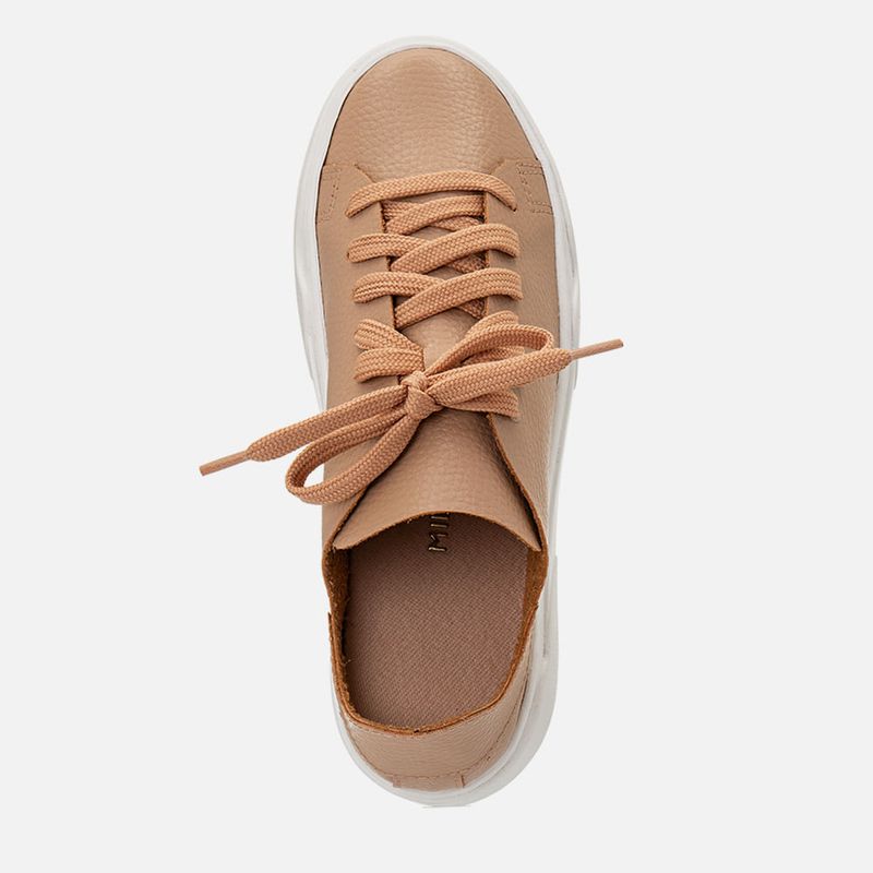 Tênis Feito em Couro Soft Macio com Sola Caixa Baixa 3D Costurada na cor Bege. Com solado tipo flatform tipo caixa baixo na cor branca com detalhes em 3D nas laterais, costurado ao cabedal, este feito em couro legítimo soft, super macio ao toque, tem detalhe em recortes e acabamento em costura pesponto nas laterais e traseira, modelo com fechamento em cadarço, ou atacador, achatado no mesmo tom do produto. O interior do modelo não é forrado, deixando a parte interna do couro aparente, que permite melhor respirabilidade do pé. A palmilha é macia e tem a marca Milano aplicada em etiqueta 3D na cor dourada.