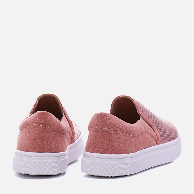 Tênis tipo Slip on com solado médio tipo caixa branco, com texturização na parte frontal do bico e costurado no cabedal, bico revestido em tecido com paetês no mesmo tom do produto, restante do modelo em material acamurçado, com recortes e detalhes em costura pesponto, contorno do cano acolchoado para maior conforto ao calçar e ajuste por elástico nas laterais.