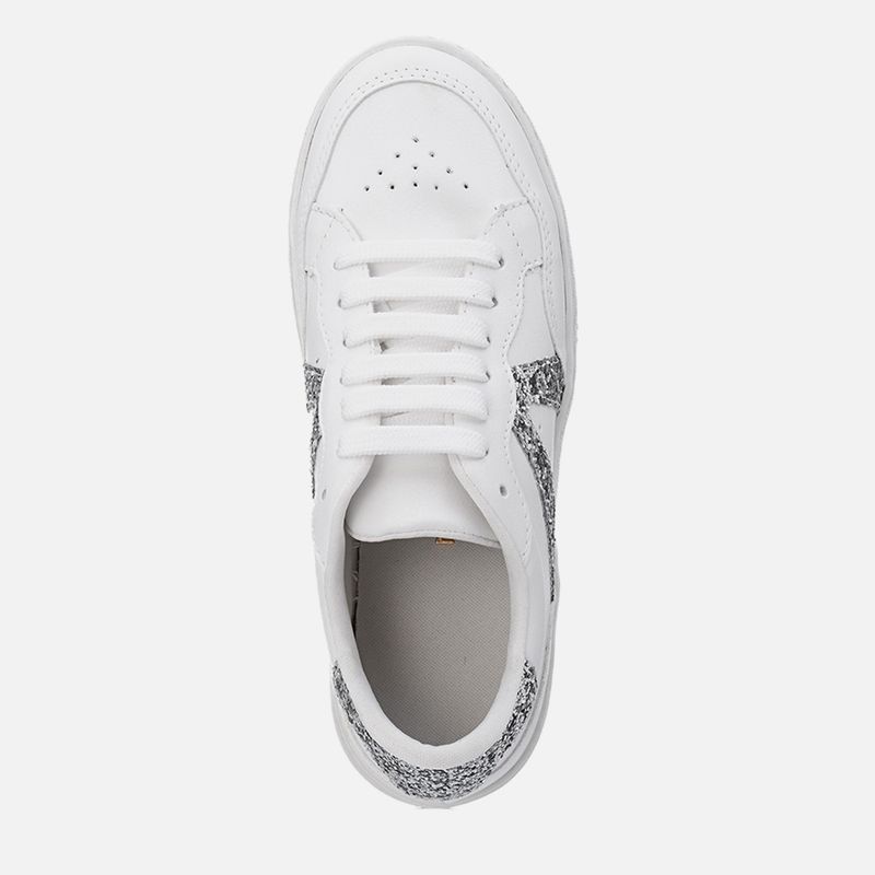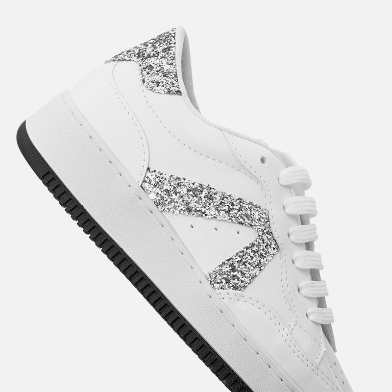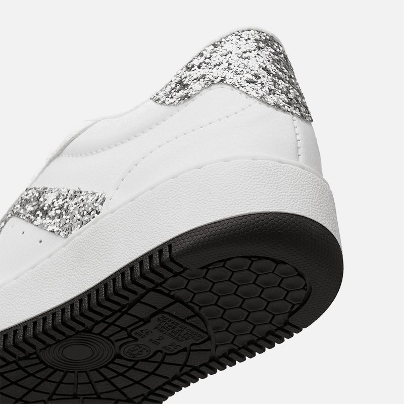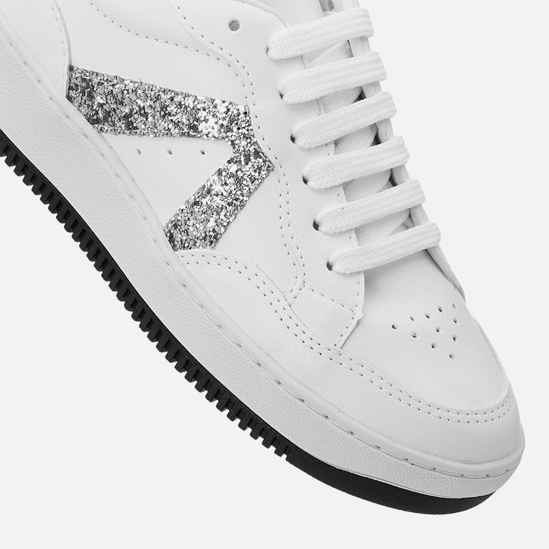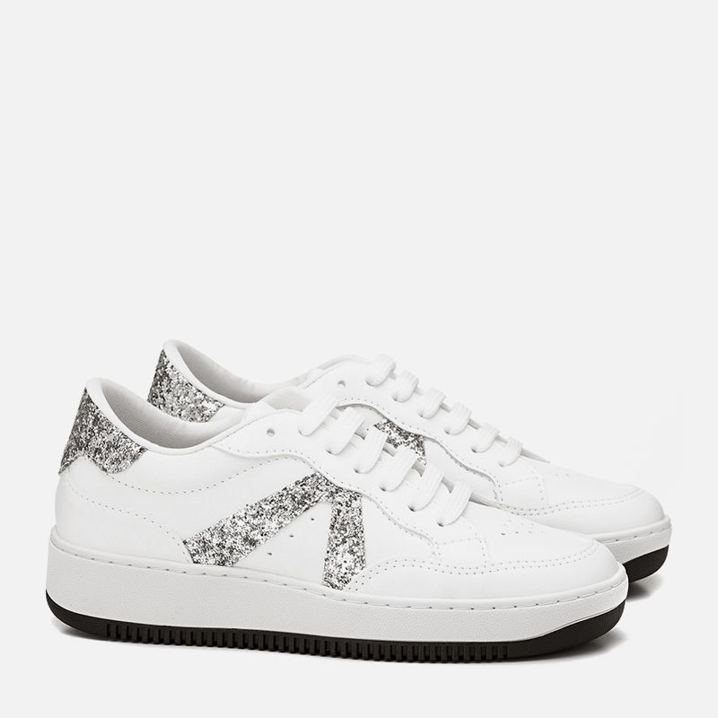 Tênis Sola Caixa Médio com Aplicação de Brilho Glitter na cor Branco. Com solado tipo caixa bicolor, com altura média, costurado no cabedal, com bico arredondado, recortes em todo o cabedal com acabamento em costura dupla pespontada, aplique nas laterais e na traseira com glitter brocal no mesmo tom do produto, fechamento por cadarço também no tom do produto, acolchoado no contorno interno do cano para maior conforto e palmilha macia com a marca Milano aplicada em etiqueta 3D na cor dourada.