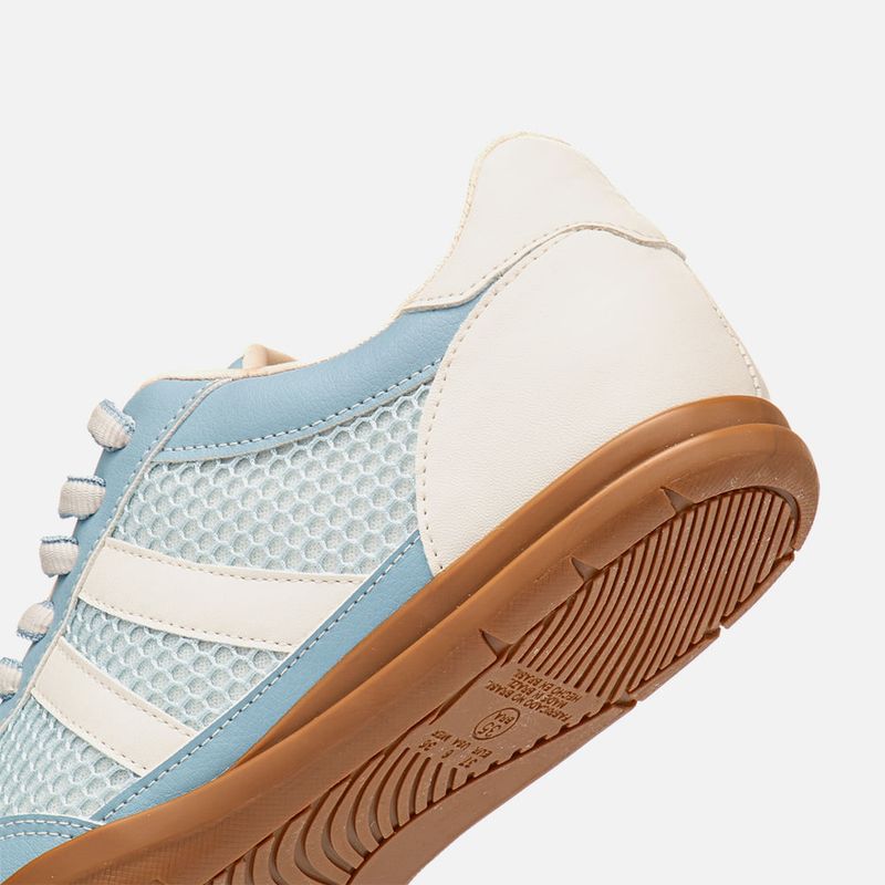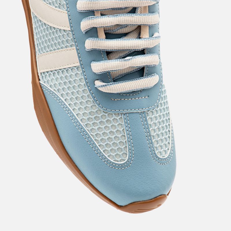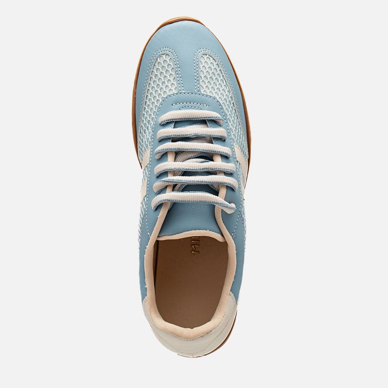 Tênis Visual Esportivo Retro Cores Mix de Materiais Tela Mesh e Tecido Aveludado tipo Camurça na cor Azul. Com solado flatform na cor caramelo com formato irregular em ondas 3D com vira no bico, cabedal com traseira e bico arredondados feito em recortes e mix de materiais, cores e texturas, sendo: tecido aveludado tipo camurça, tela mesh vazada e napa lisa, possui recortes em composição por todo o modelo com duas tiras e traseira em destaque, o fechamento é feito por cadarço, ou atacador, arredondado bicolor no mesmo tom do produto. A lateral do cano é acolchoada super macia para maior conforto do calce, forrada em tecido no mesmo tom do produto, tem palmilha macia também no mesmo tom com a marca Milano aplicada em etiqueta 3D na cor dourada.