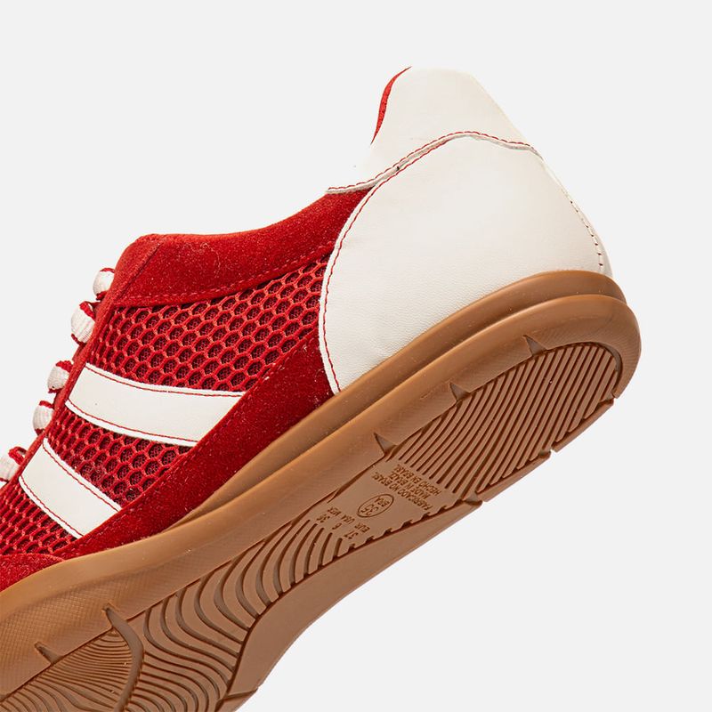 Tênis Visual Esportivo Retro Cores Mix de Materiais Tela Mesh e Tecido Aveludado tipo Camurça na cor Vermelho. Com solado flatform na cor caramelo com formato irregular em ondas 3D com vira no bico, cabedal com traseira e bico arredondados feito em recortes e mix de materiais, cores e texturas, sendo: tecido aveludado tipo camurça, tela mesh vazada e napa lisa, possui recortes em composição por todo o modelo com duas tiras e traseira em destaque, o fechamento é feito por cadarço, ou atacador, arredondado bicolor no mesmo tom do produto. A lateral do cano é acolchoada super macia para maior conforto do calce, forrada em tecido no mesmo tom do produto, tem palmilha macia também no mesmo tom com a marca Milano aplicada em etiqueta 3D na cor dourada.
