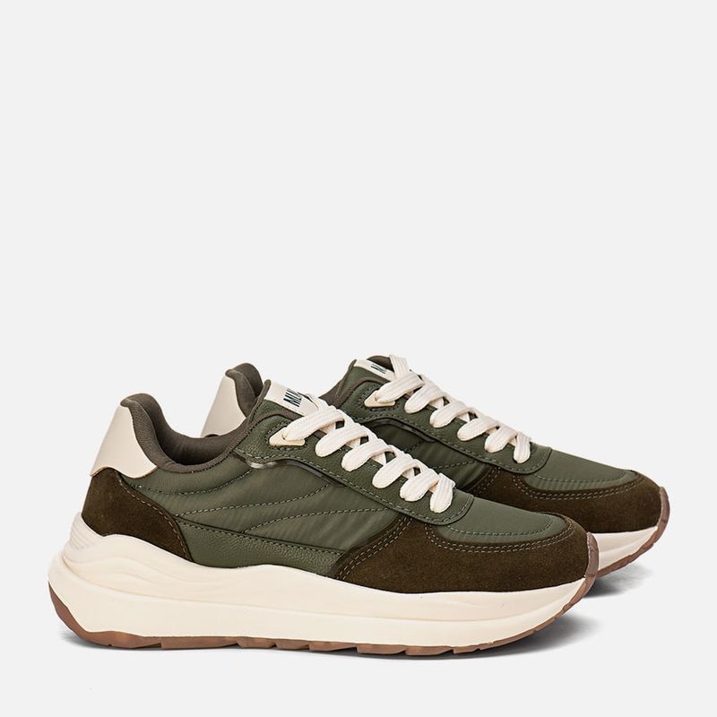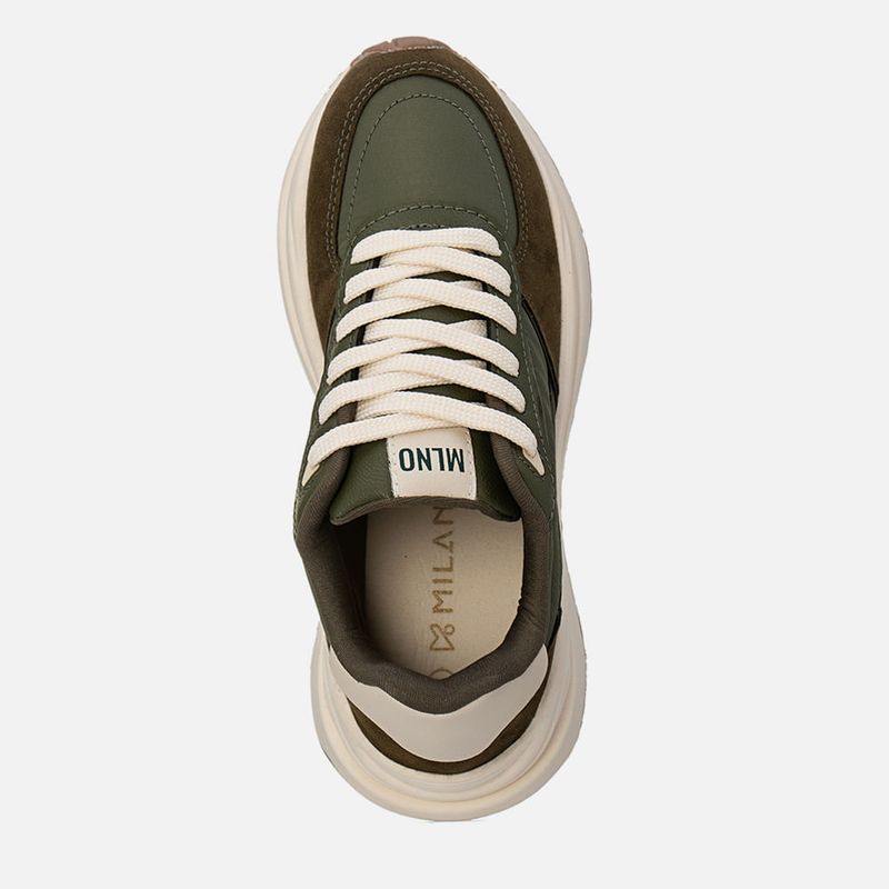 Tênis Casual com Visual Esportivo Robusto tipo Daddy Sneaker ou Chuncky com Sola Alta Bicolor, Cabedal em Recortes e Mix de Materiais com Amarração na cor Verde. Com solado alto robusto bicolor bipartido – sendo a base levemente tratorada dentada com biqueira aparente no cabedal e a parte superior com detalhes texturizados 3D, cabedal com traseira e bico arredondados composto de recortes e mix de materiais e texturas – napa lisa, napa com textura floater, napa em brilho verniz e malha mesh com trama mínima, e acabamento e detalhes em costuras pespontos no mesmo tom do produto, a peça da traseira tem tom que se destaca das demais peças da composição, o fechamento do modelo é feito por cadarço achatado no mesmo tom do produto, não possui ilhós, apenas o último passador do atacador é feito em peça emborrachada, na língua tem uma aplicação com a marca MLNO (resumo de Milano) em tom metalizado. O interior do cano é forrado em tecido e é acolchoado para maior conforto do calce, a palmilha é macia também revestida em tecido e tem a marca Milano e a numeração aplicadas em silk na cor dourada.